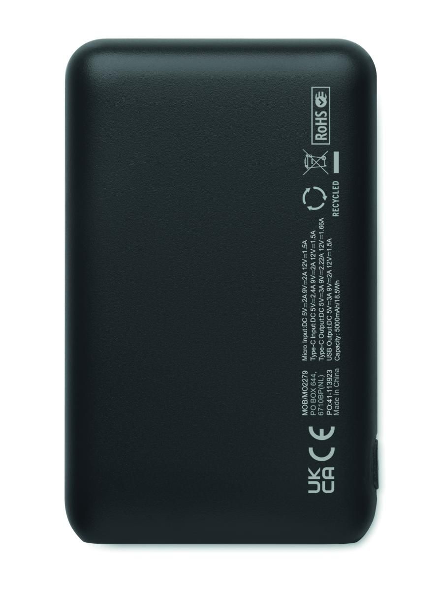 Powerbank PD 20W. 5000 mAh. ABS reciclado (GRS). Salidas: USB-C hasta 20W y 2 USB-A hasta 18W. Entrada: USB-C y Micro-B 18W. 4 indicadores LED. Cable Type-C a Type-C (2A) con adaptador USB-A incluido.