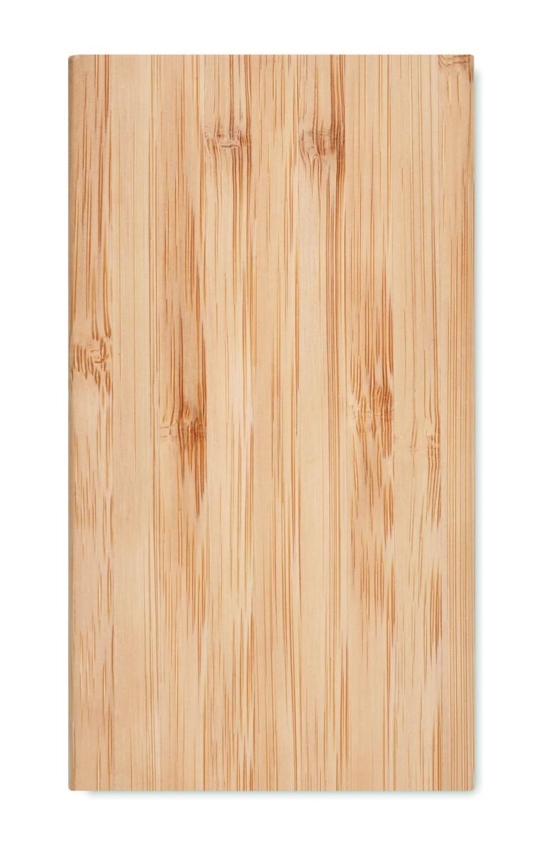 Powerbank solar. 4000 mAh. Bambú. Salidas: USB-A hasta 5W. Entrada: USB-A 5W. Entrada solar 150–200mAh/h. Luz LED (3 lm). Conector Micro USB integrado. Cable USB-A a Micro USB con adaptador USB-C incluido.