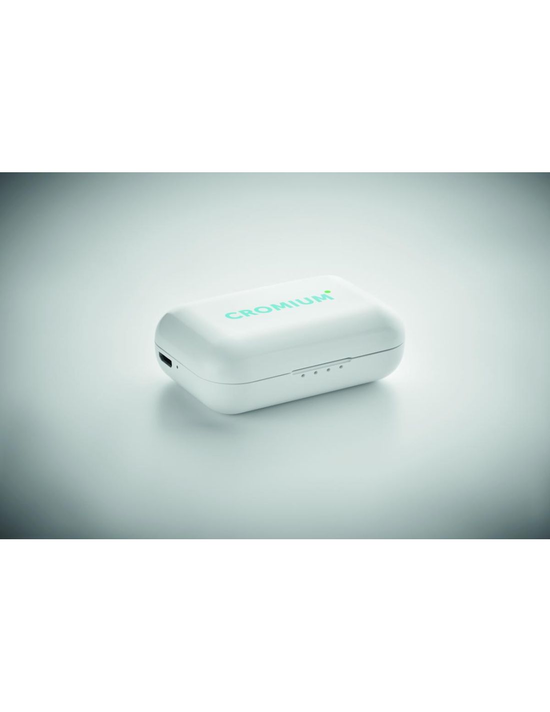 Set de 2 auriculares True Wireless Stereo (TWS) 5.3 con micrófono y batería de 30 mAh integrada. Tiempo de reproducción aprox. 3 horas. Emparejamiento automático. Incluye un cable de carga micro USB y una estación de carga de 185 mAh. Fabricado con ABS reciclado.