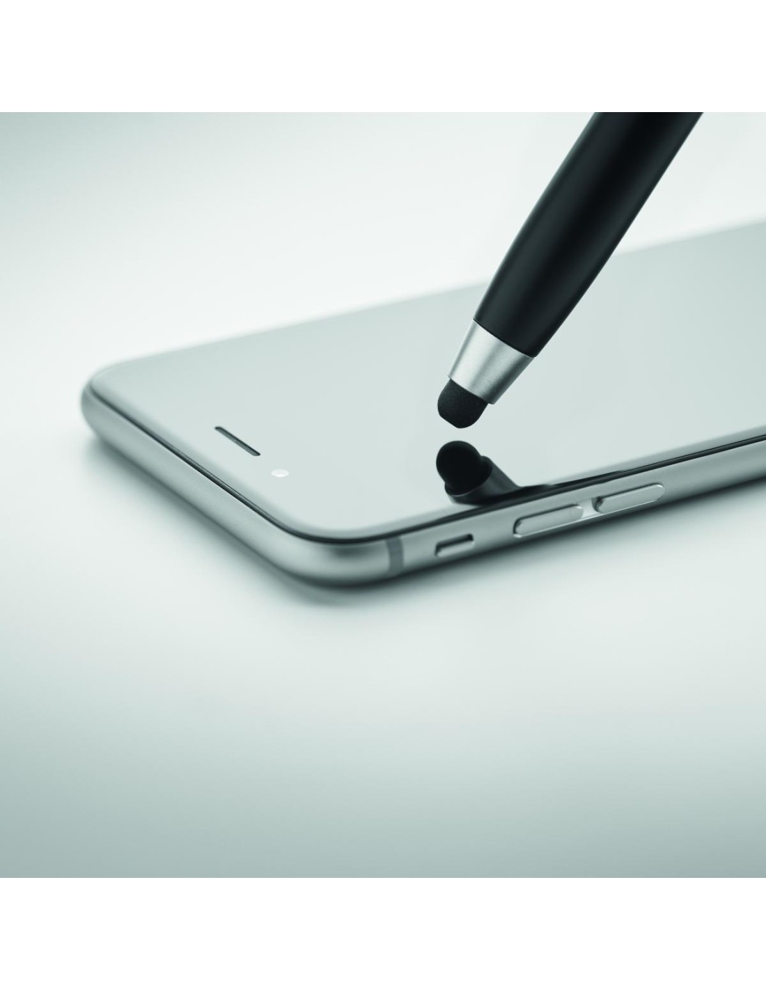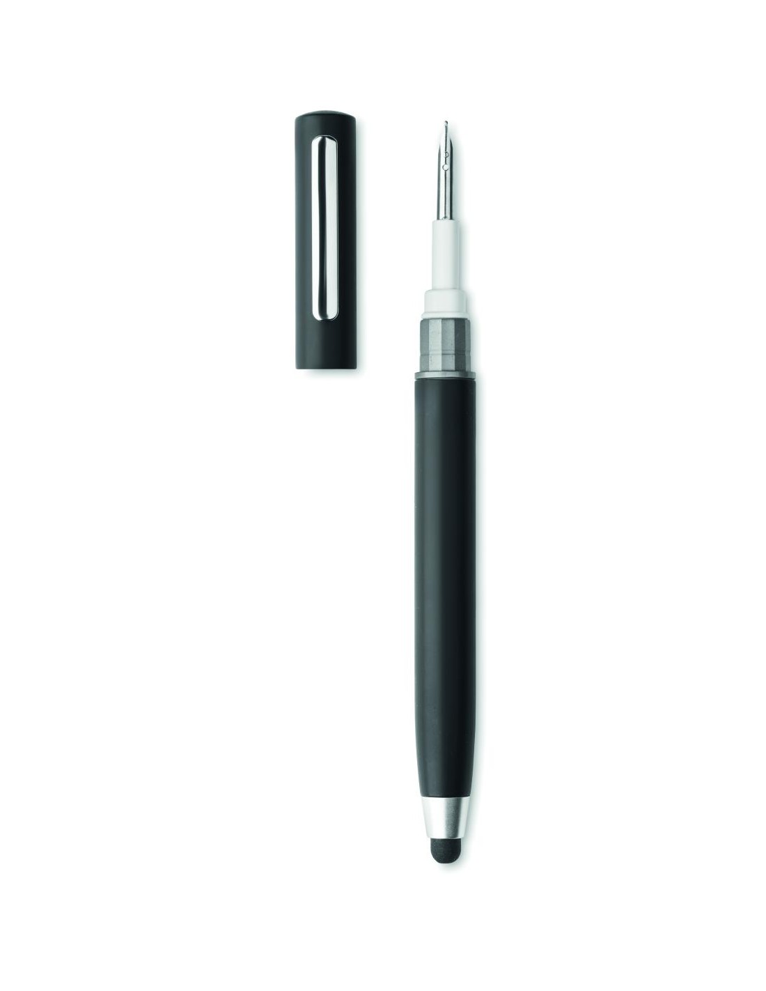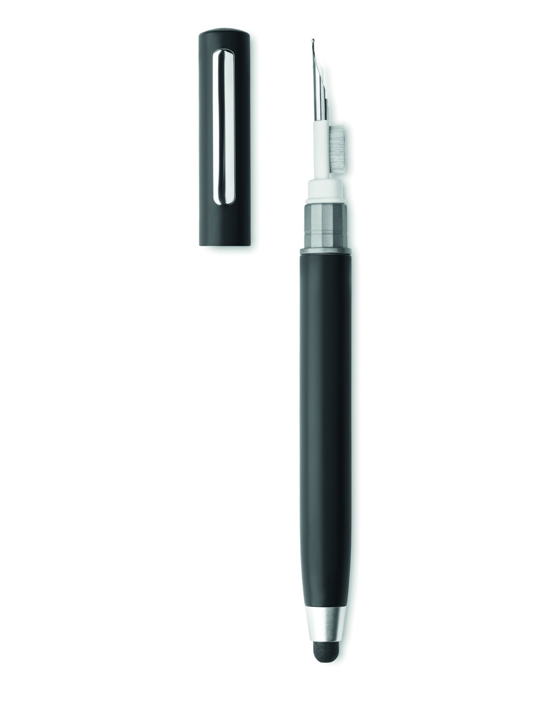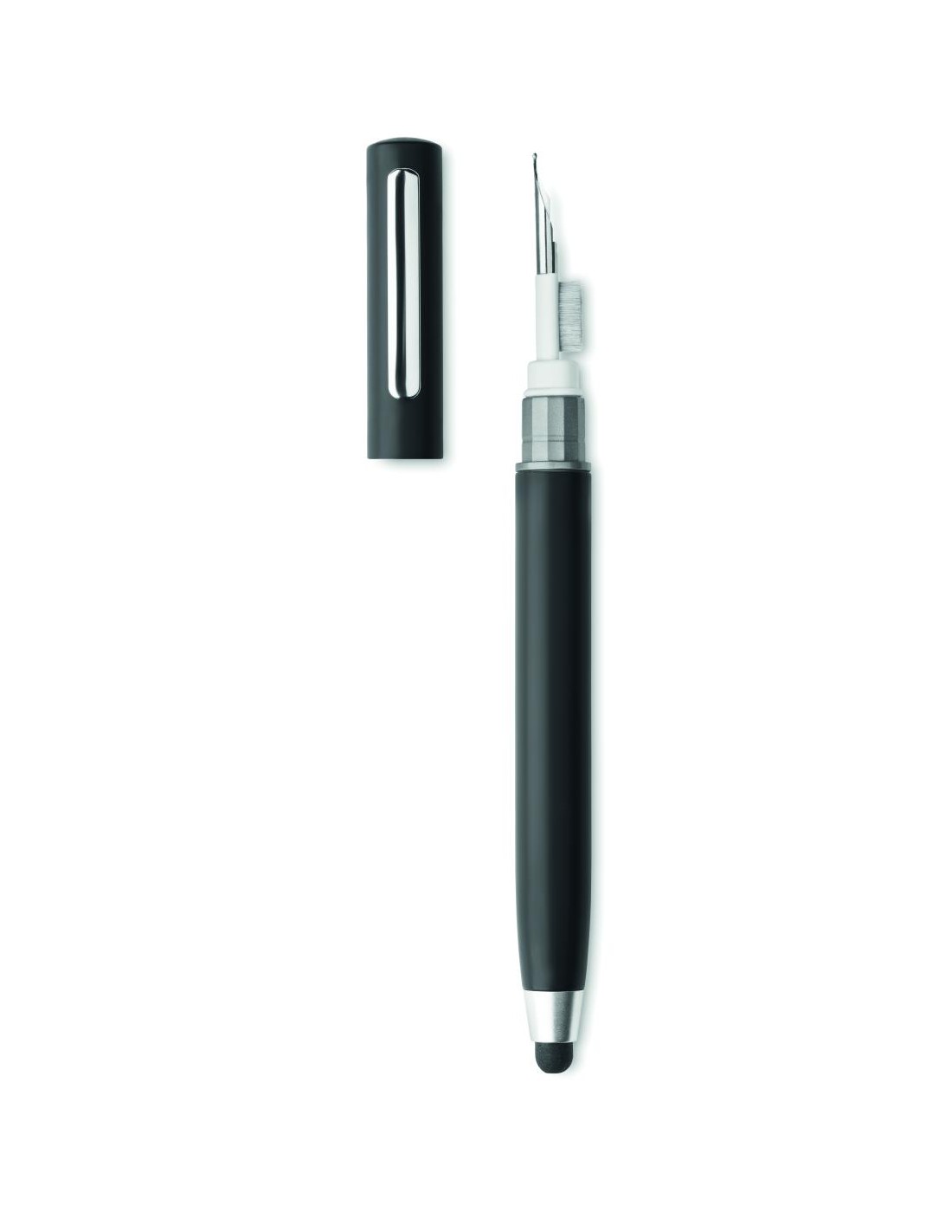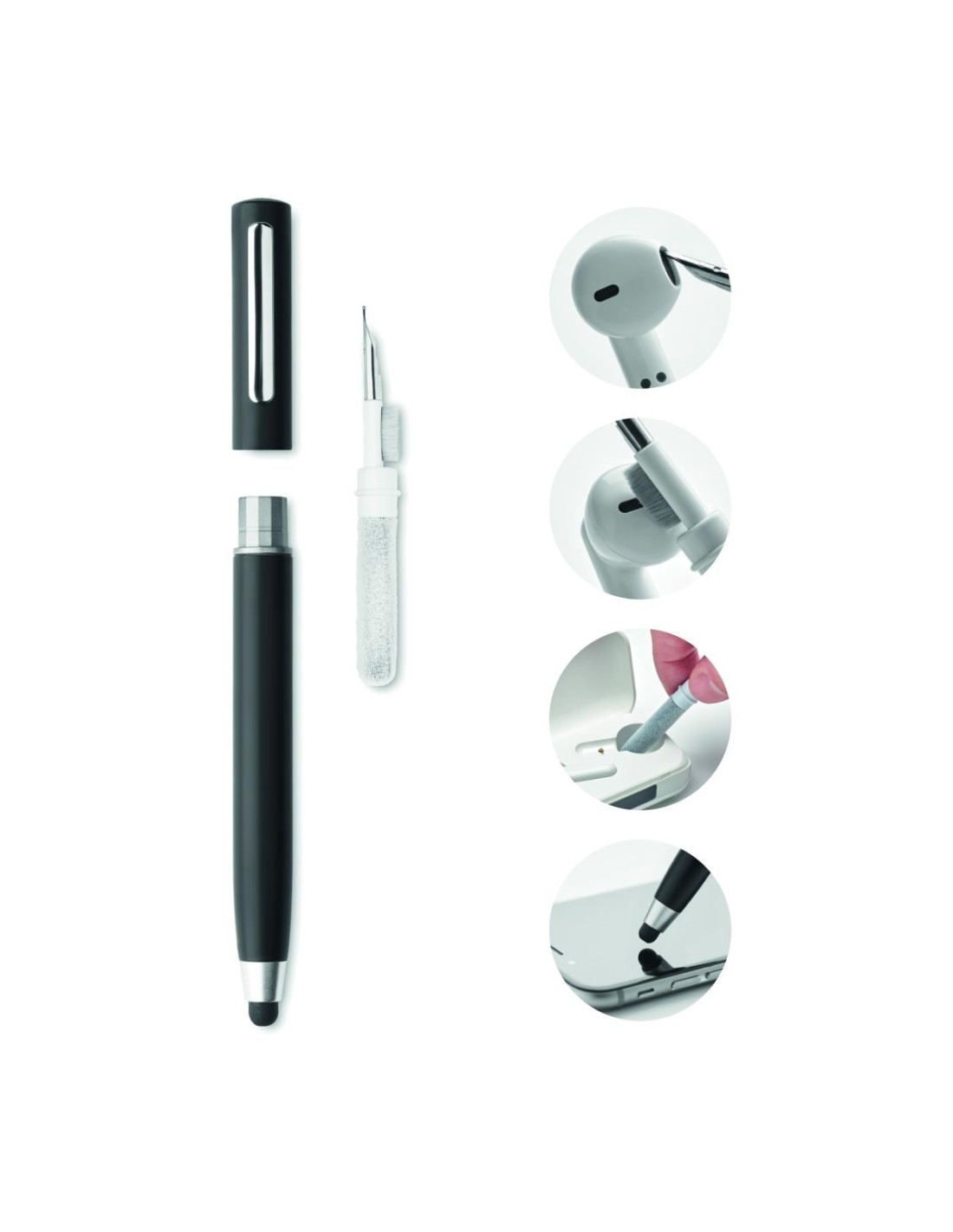 Bolígrafo giratorio con puntero en ABS. Dispone de un kit de limpieza de auriculares TWS: punta metálica, esponja y cepillo. Tinta azul.
