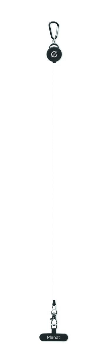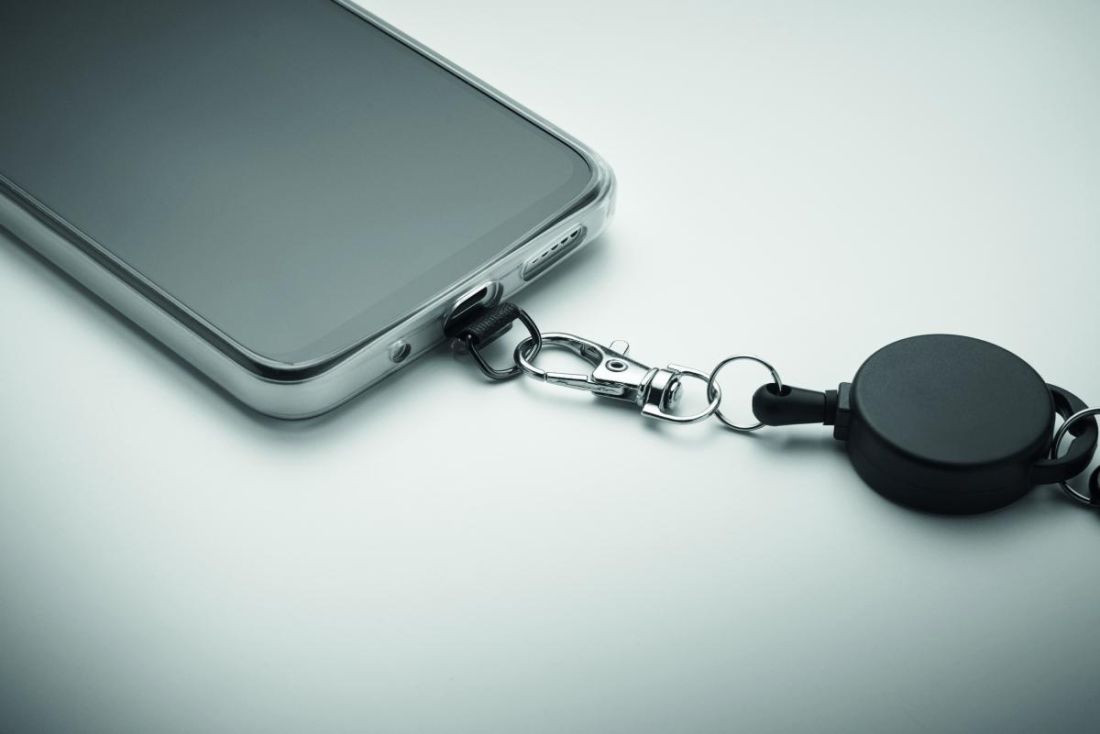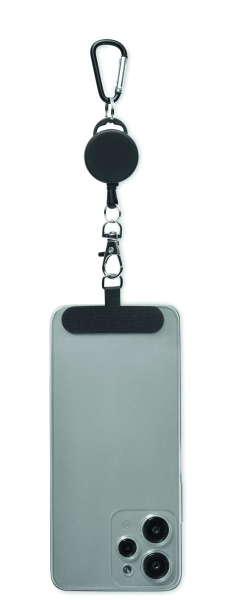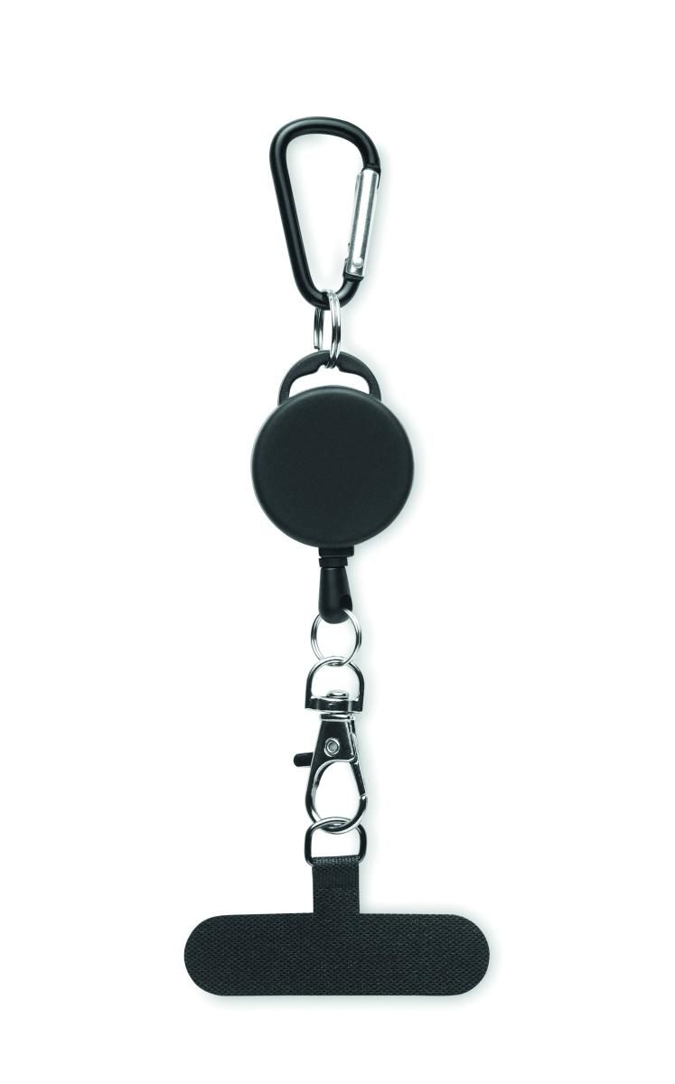 Soporte retráctil para teléfono y/o tarjeta identificativa en ABS con mosquetón de aluminio. El mosquetón no es para escalada (uso no profesional).