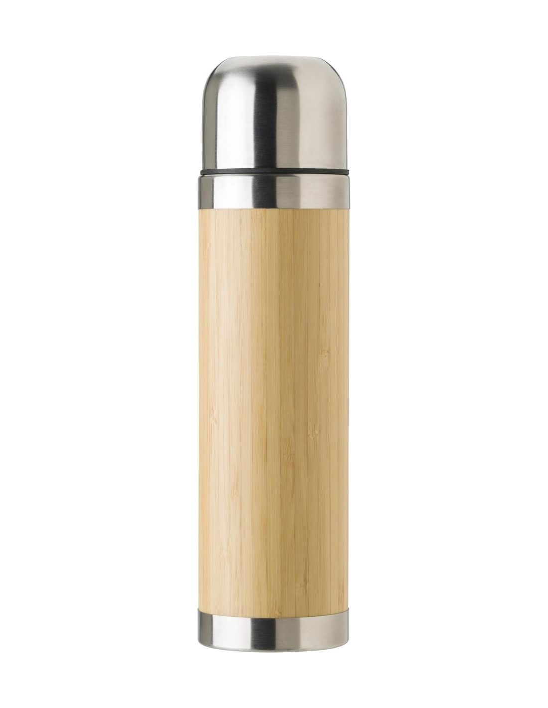 Termo de bambú (400 ml) con tapón y detalles de acero inoxidable, doble pared. Presentado en una caja de regalo. Evitar bebidas ácidas o con gas.