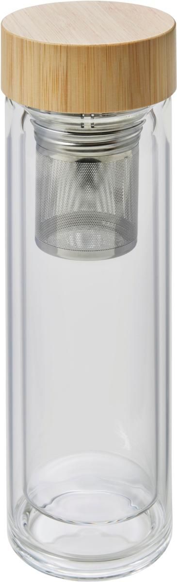 Termo de cristal y bambú (420 ml) de doble pared. Incluye un infusor de té de acero inoxidable. Evitar bebidas ácidas o con gas. Presentado en una caja de cartón marrón.