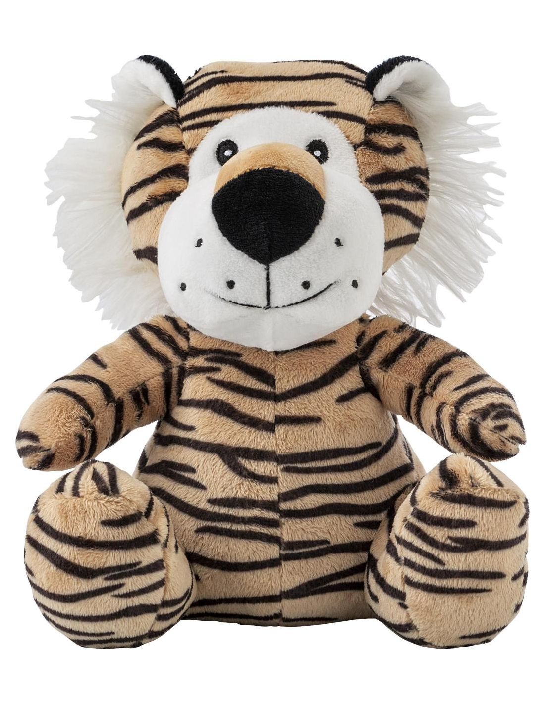 Tigre de peluche con etiqueta para su personalización. Ojos, boca y bigotes bordados. Se puede combinar con la camiseta ref 5013.