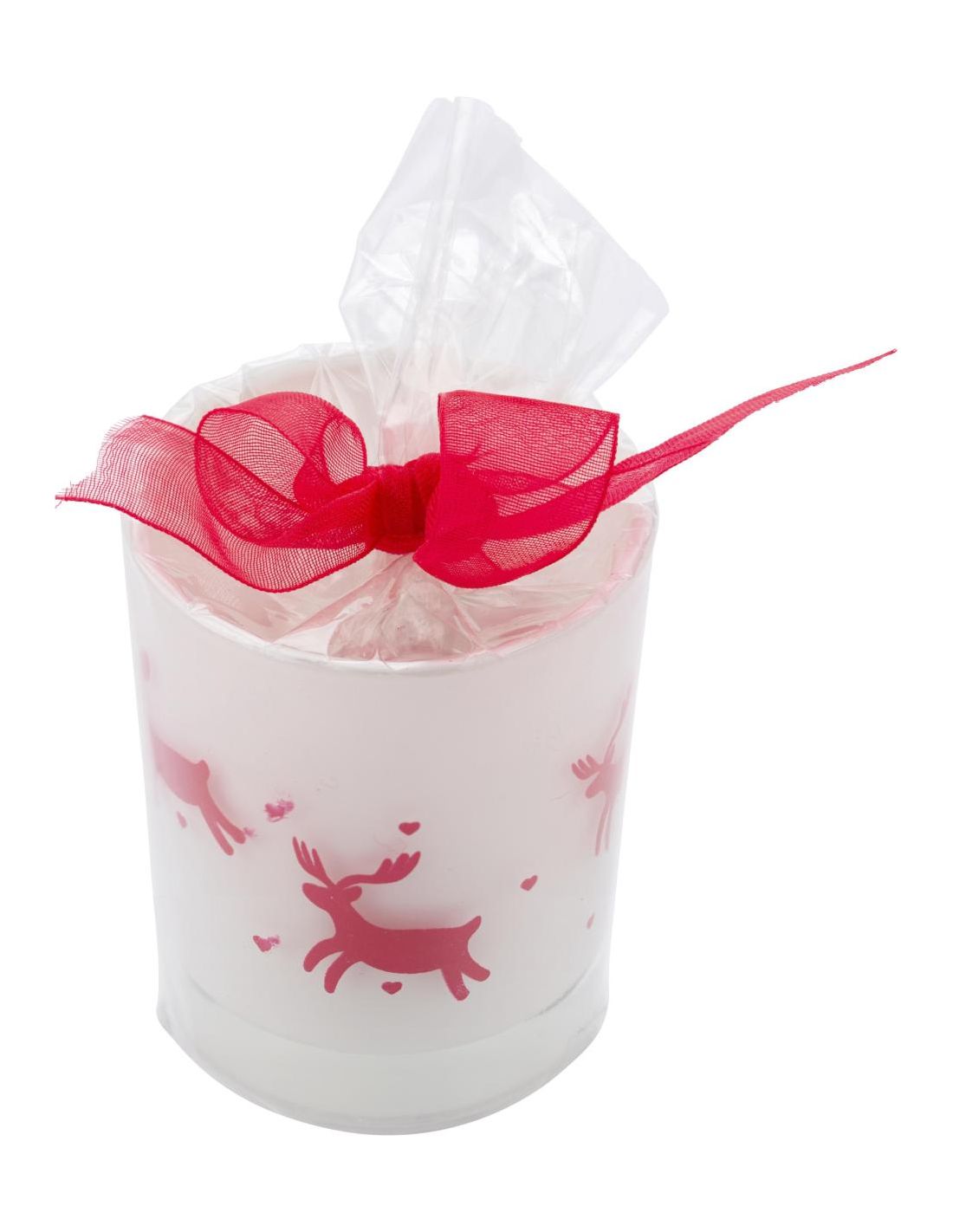 Vaso de cristal con una vela y decoración navideña. Envuelto con papel transparente y una cinta roja.
