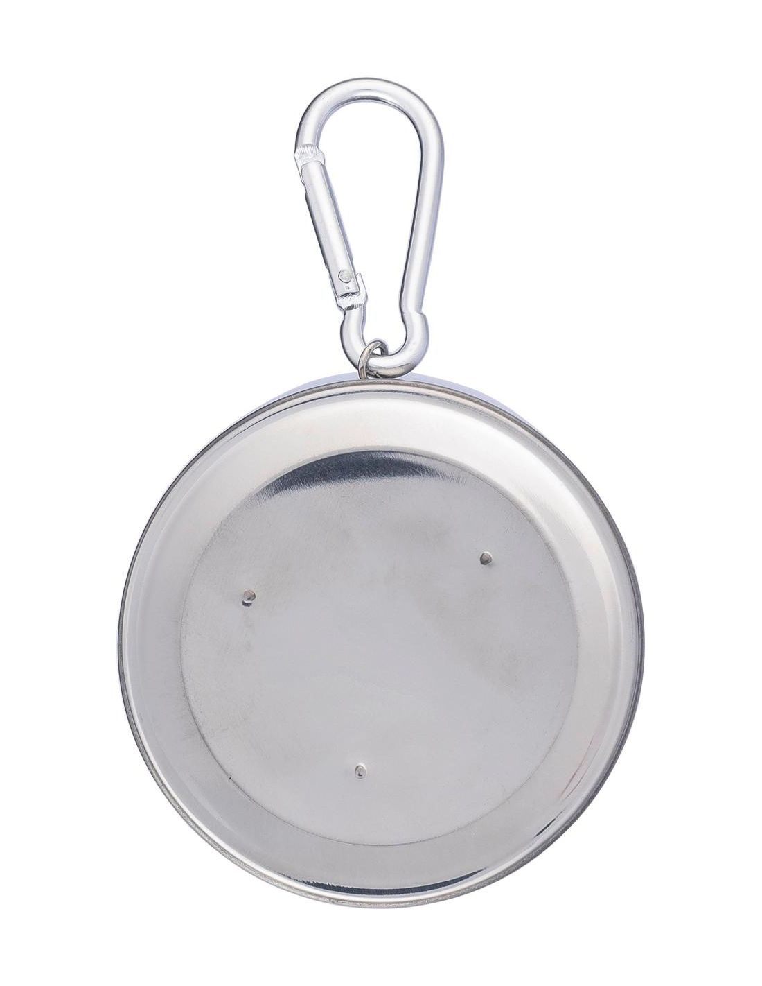 Vaso plegable de acero inoxidable (220 ml) con mosquetón de metal. Presentado en una caja de cartón marrón.