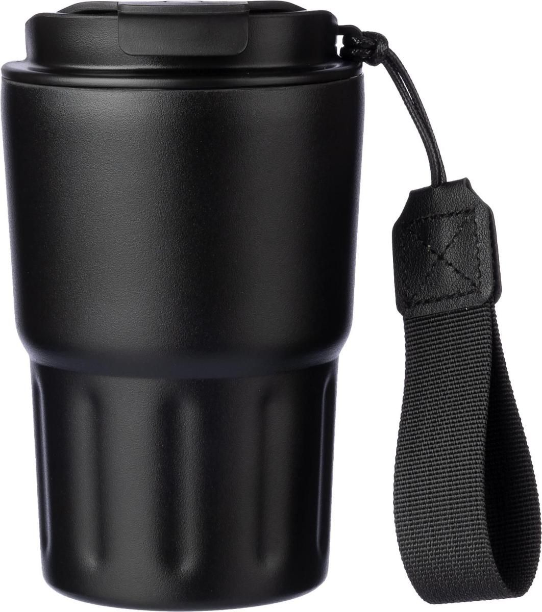 Vaso termo de doble pared con recubrimiento en polvo de acero inoxidable (320 ml). Inox. 304 en el interior, inox. 201 en el exterior. Tapa de PP con asa y correa a juego. Presentado en una caja de cartón marrón.