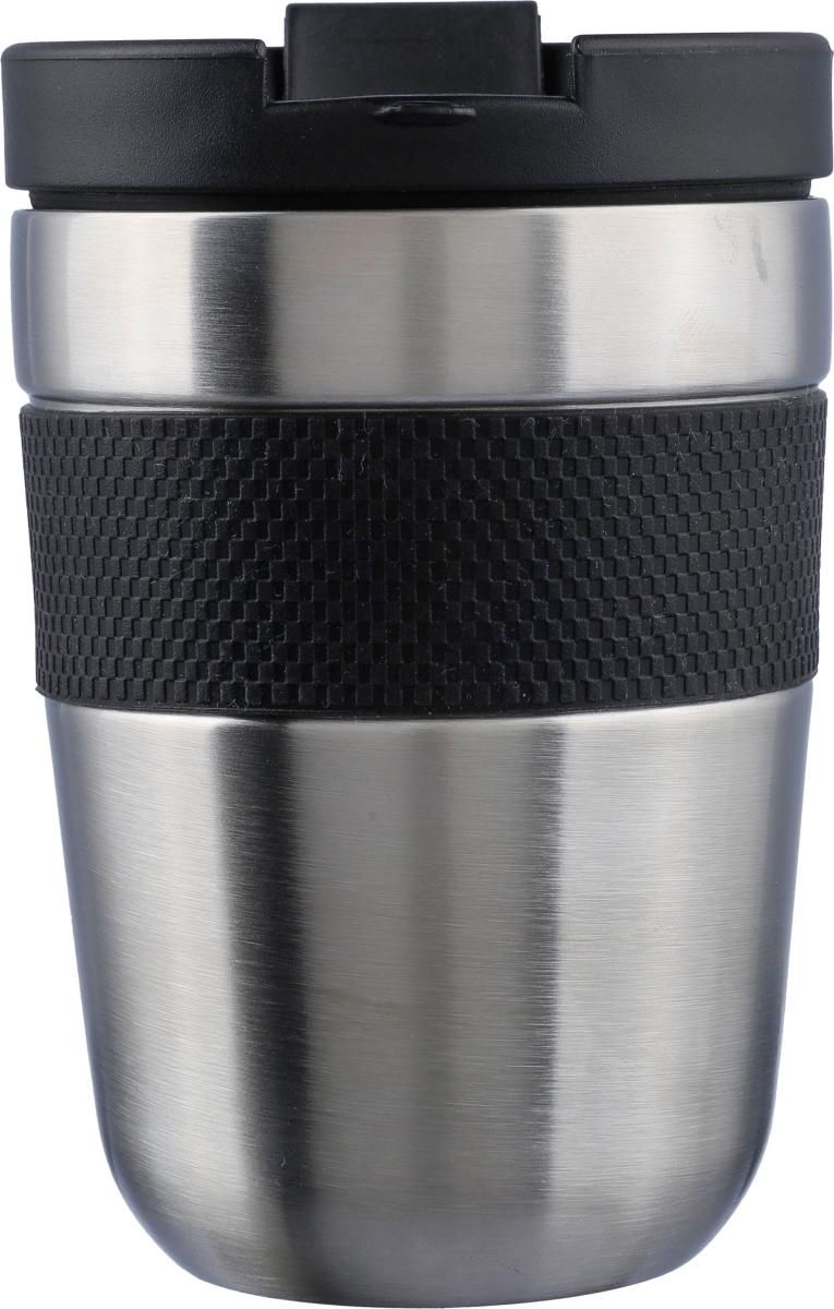 Vaso de acero inoxidable de doble pared (300 ml) con tapa de PP y agarrador de silicona. Mantiene el contenido caliente durante 4 horas y frío durante 6 horas. Interior acero inoxidable 304 y exterior acero inoxidable 201. Presentado en una caja de cartón marrón.