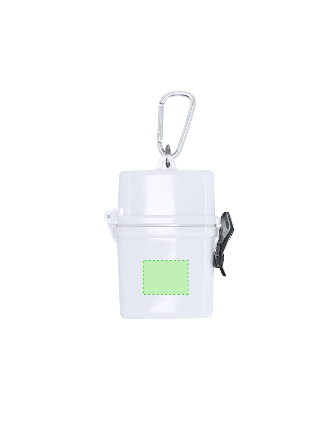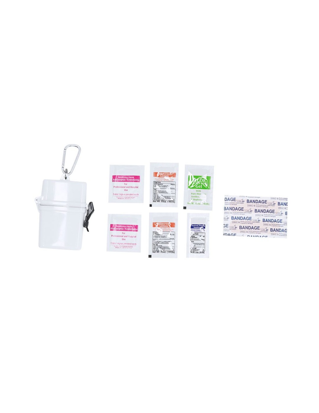 Kit de excursión de 8 accesorios presentado en un estuche en resistente ABS, con práctico mosquetón metálico para un cómodo transporte. Incluye toalla para limpieza de manos, toallita alivia picaduras, protección solar SPF30, after sun, gel hidroalcohólico y vendas.