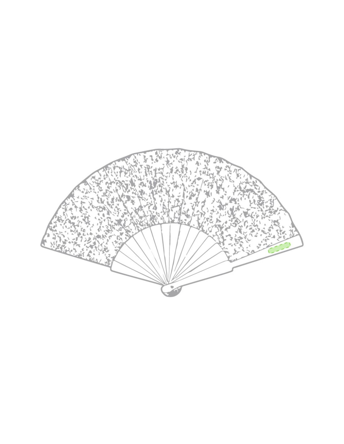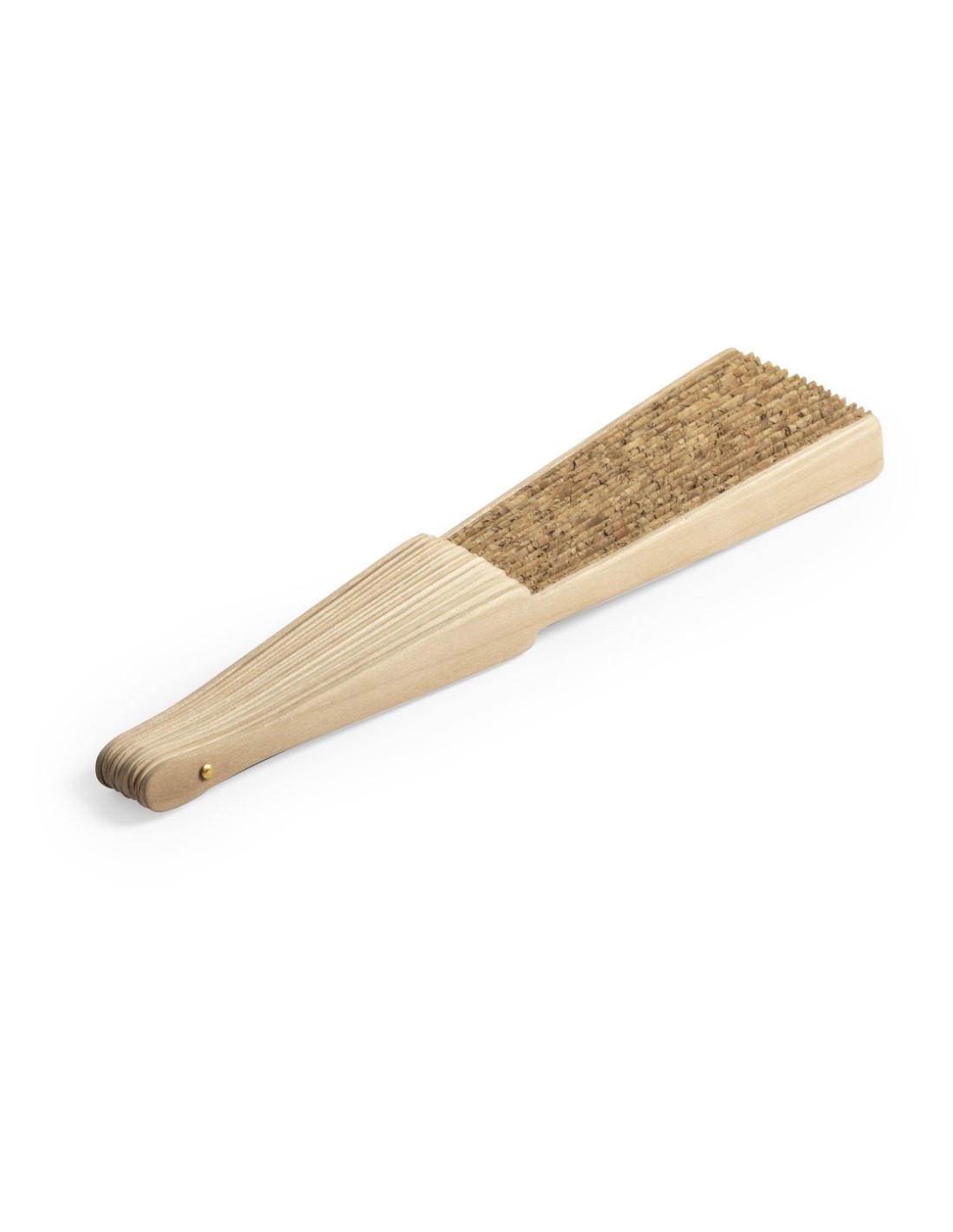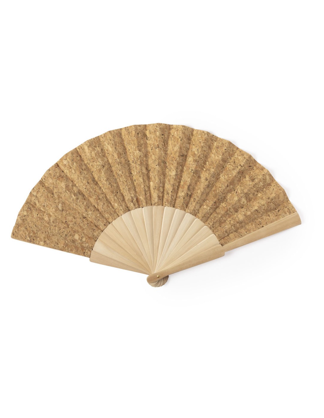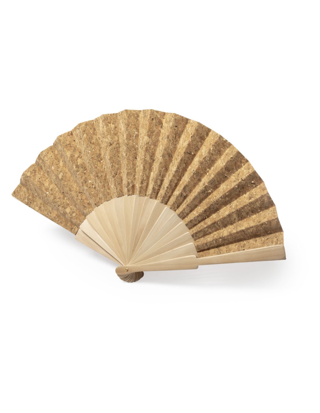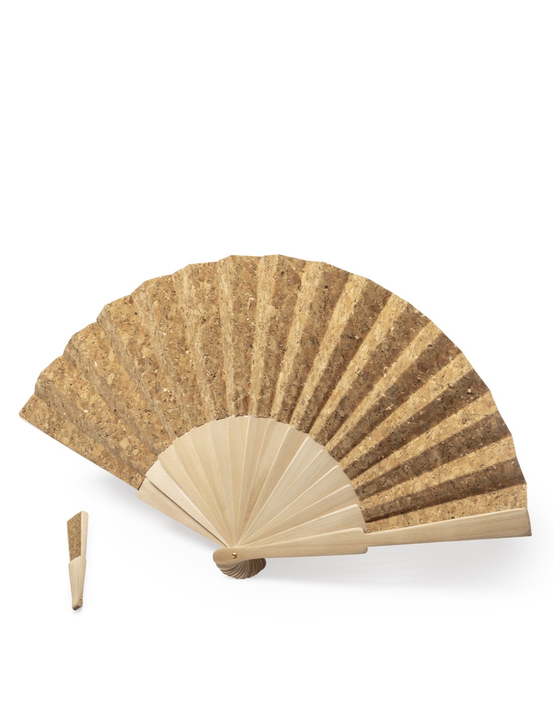 Abanico de línea nature, con varillas de madera y tela en corcho natural. Presentado en caja individual de diseño eco.