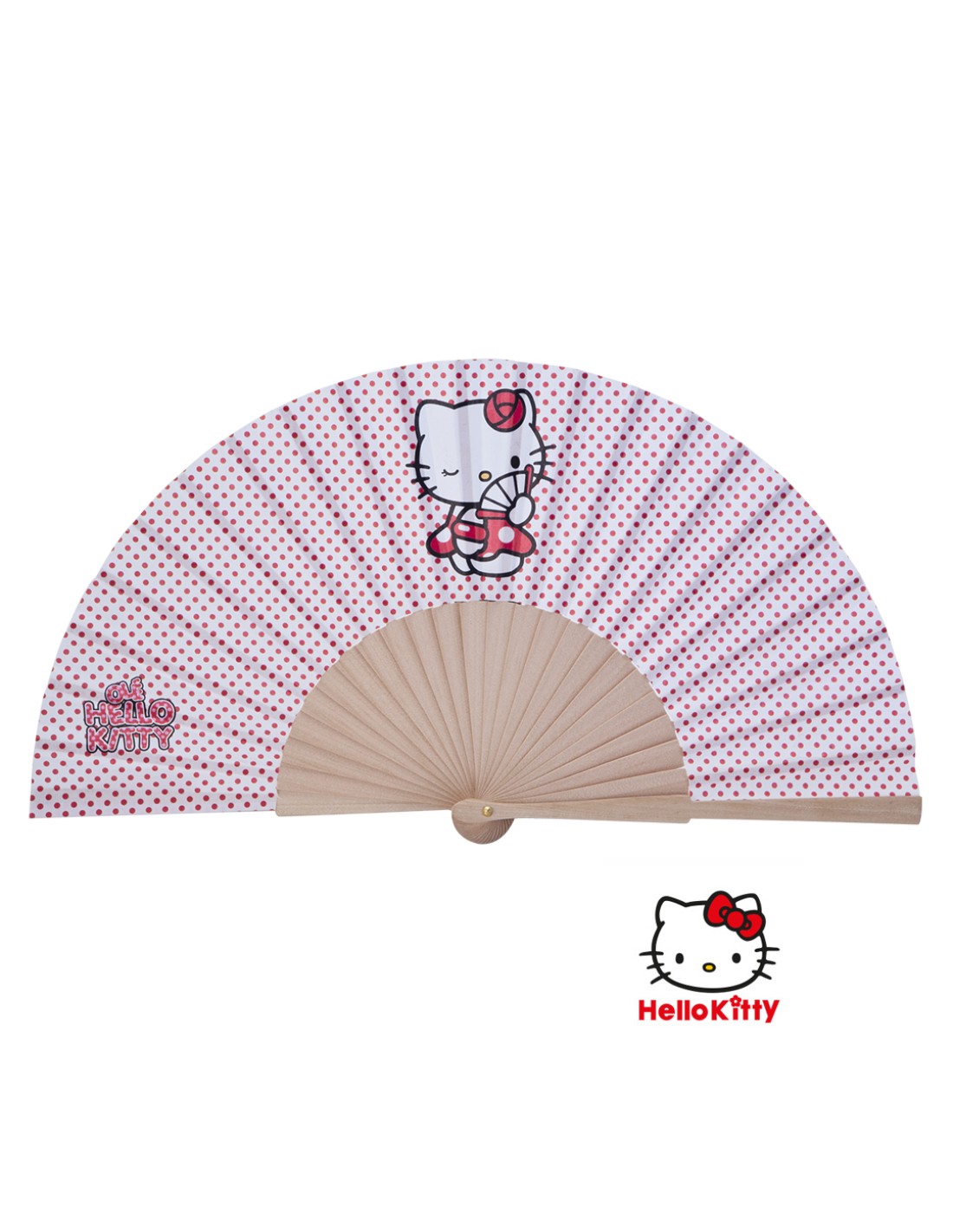 Abanico de Hello Kitty con varillas en madera natural y original diseño en tela con gatito de la marca. Presentado en caja individual.