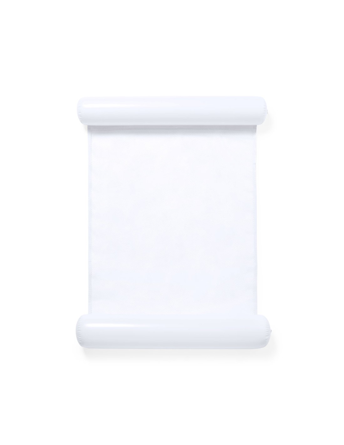 Original colchoneta con extremos hinchables en resistente PVC. Enrollable y con resistente redecilla central de 80x70 cm en poliéster de color blanco. Con plegado especial para fácil impresión y disponible en variada gama de colores.