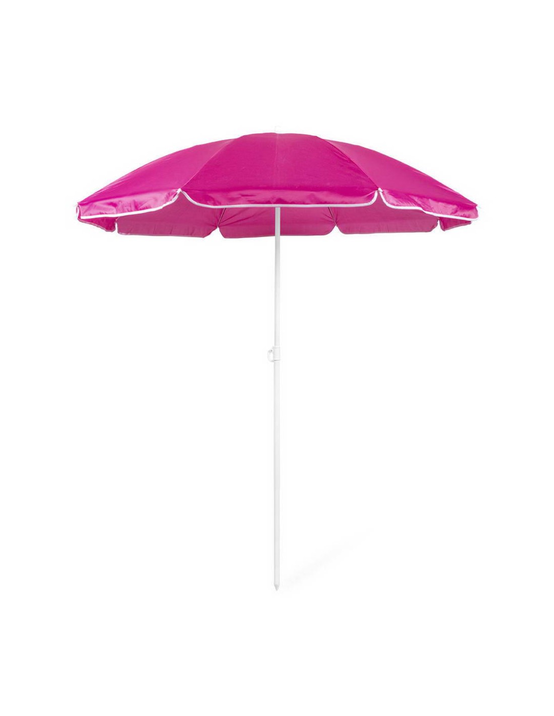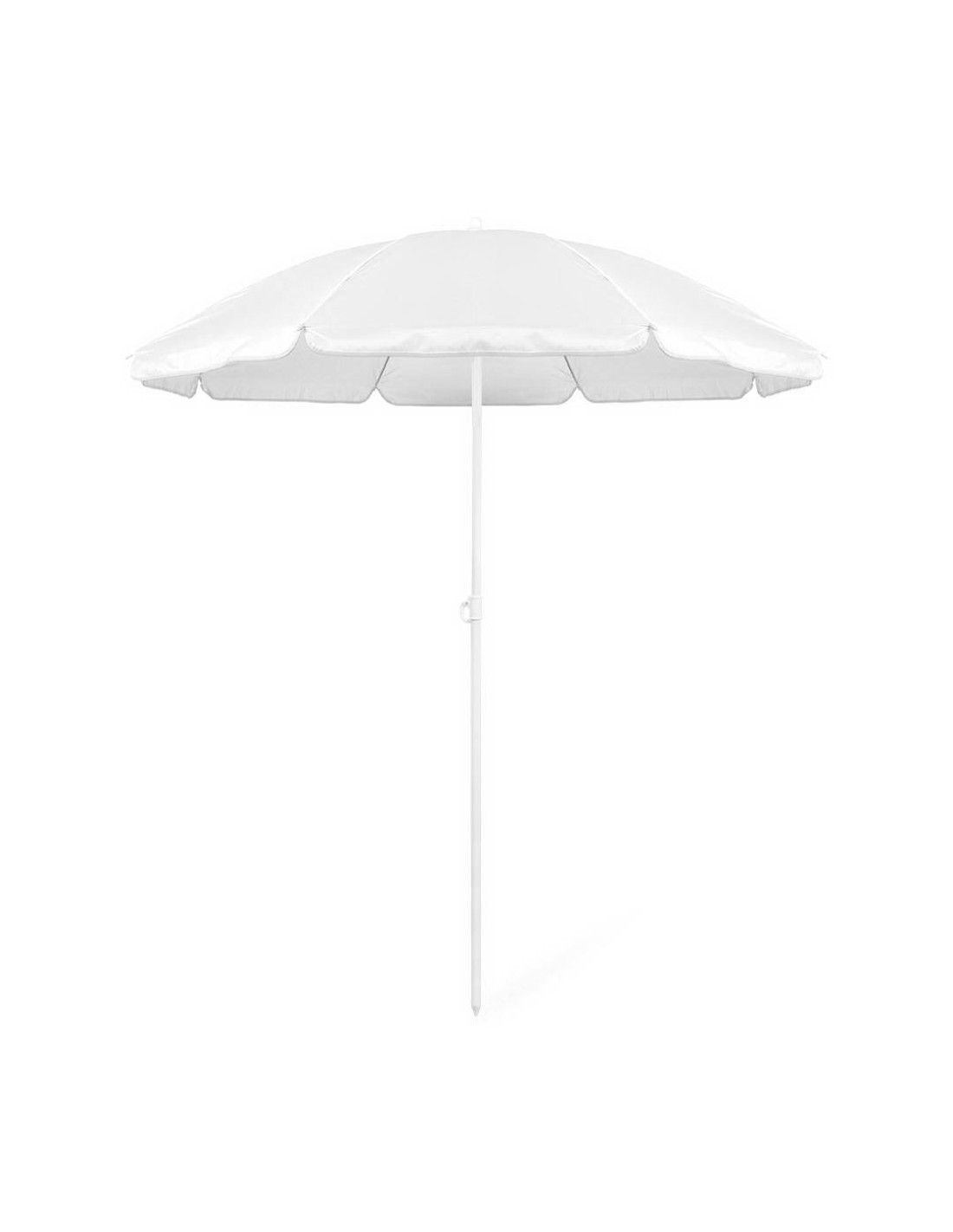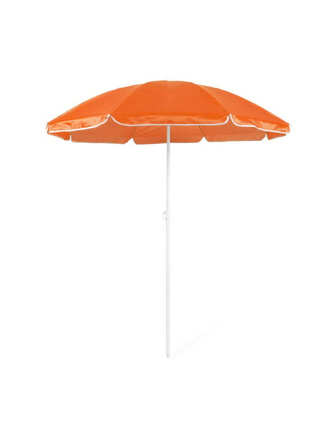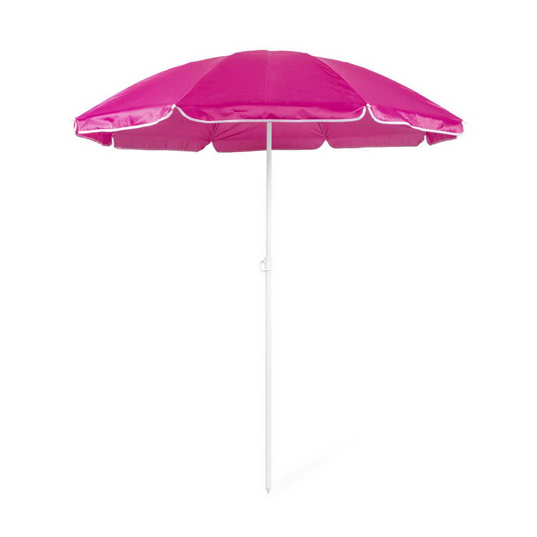 Sombrilla de playa de 8 paneles de resistente nylon en variada gama de vivos colores. De 150cm de diámetro, con faldones laterales ribeteados, tubos metalizados en color blanco y ajustable en altura. Presentada en funda de PVC con cinta de transporte para hombro.