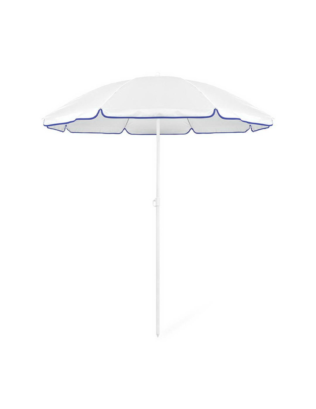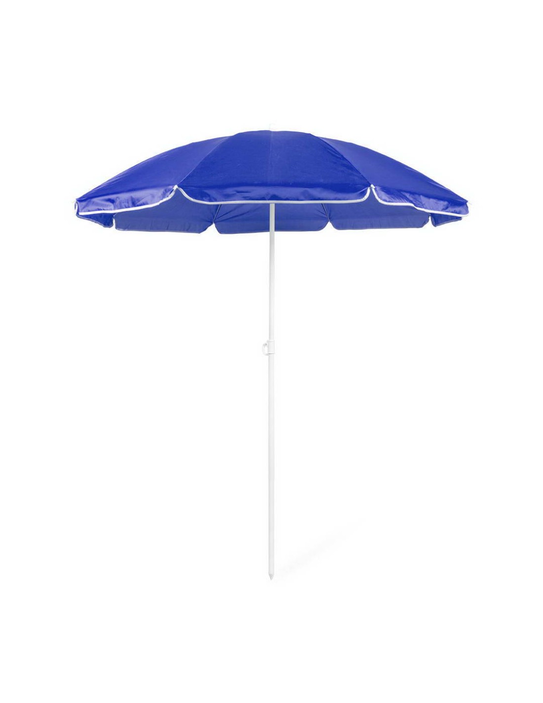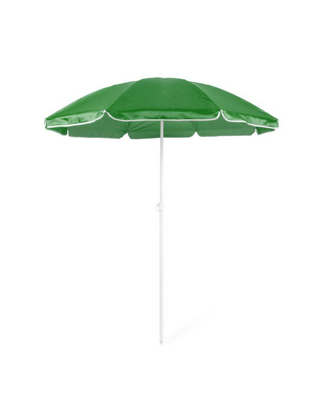 Sombrilla de playa de 8 paneles de resistente nylon en variada gama de vivos colores. De 150cm de diámetro, con faldones laterales ribeteados, tubos metalizados en color blanco y ajustable en altura. Presentada en funda de PVC con cinta de transporte para hombro.