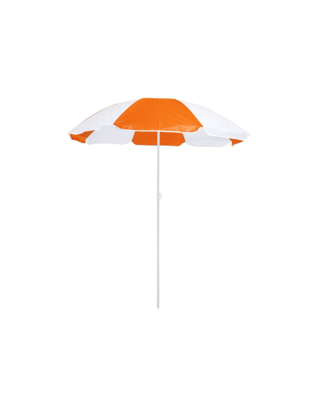 Sombrilla de playa de 8 paneles en resistente nylon de combinación bicolor. De 150cm de diámetro, con faldones laterales ribeteados, tubos metalizados en color blanco y ajustable en altura. Presentada en funda de PVC con cinta de transporte para hombro. Disponible en variada gama de colores combinados.