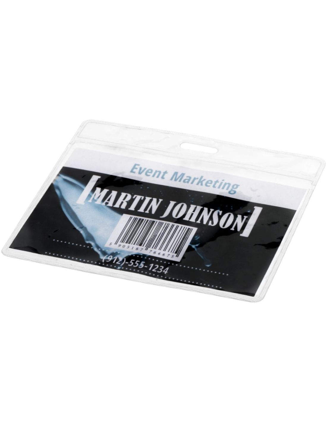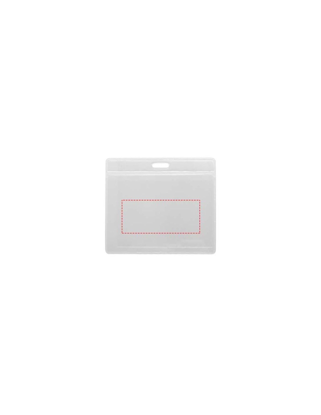 Portatarjetas con ranura en la parte posterior y perforado en la parte superior para sujetar una cinta de acreditaciones, lanyard o roller clip. Tamaño: 8,8 x 10,0 cm. Este artículo puede llevar una tarjeta de 9,4 x 6,7 cm.